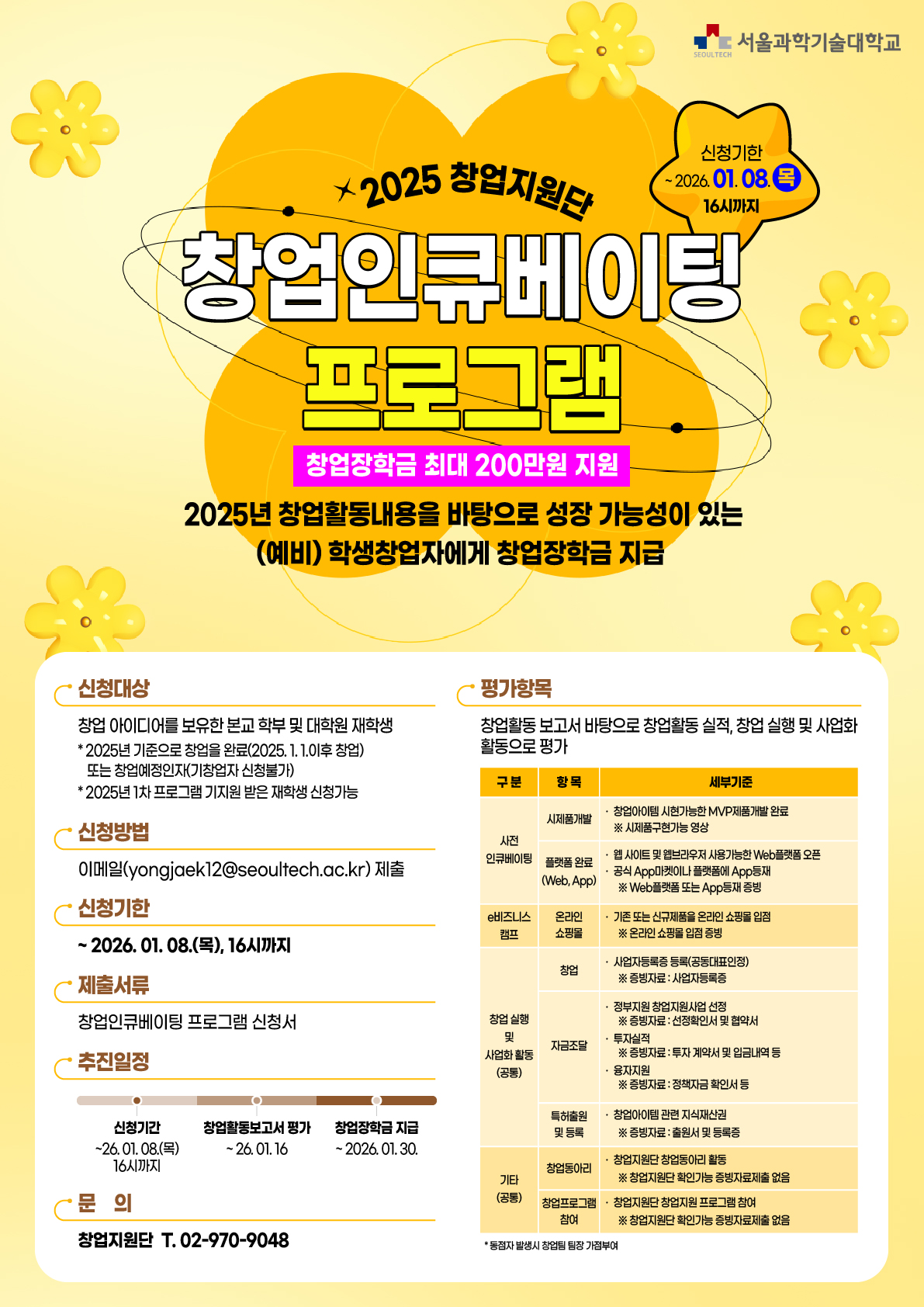 ✅ 추진일정: 1. 신청: ~26. 1. 8.(목), 16시까지 2. 평가: ~26. 1. 16(금), 창업활동보고서 서면평가 3. 지급: ~26. 1. 30.(금),창업장학금 지급