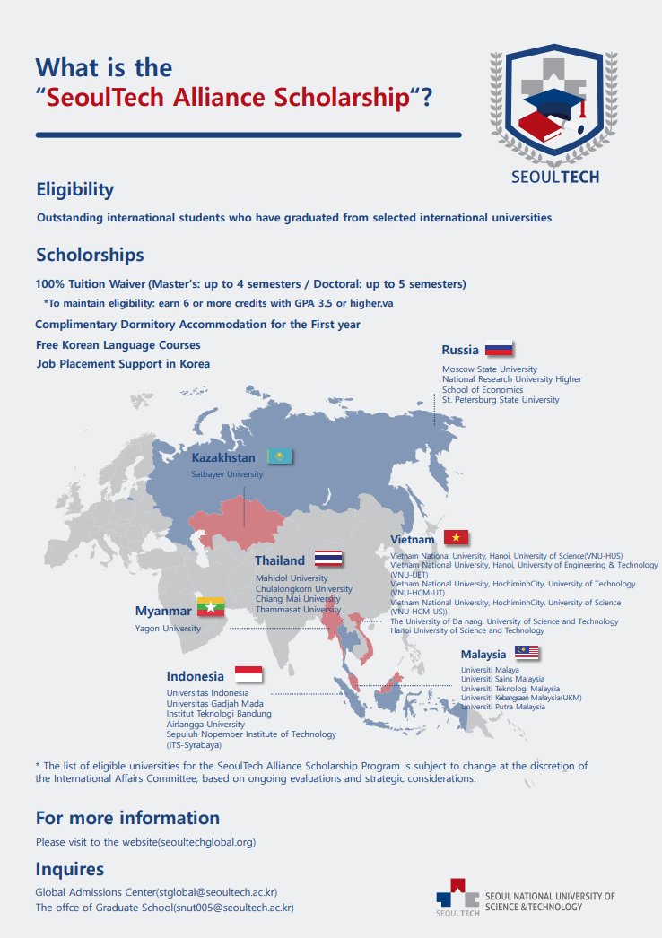 Scholarship for International Graduate Students admitted after obtaining a Bachelor's Degree or above from a SeoulTech Alliance Partner University* - Application period 2) Doctoral Program (5 semesters + 1 additional semesters for those who cannot graduate or complete) 3) Integrated Master’s and Doctoral Program (7 semesters + 2 additional semesters for those who cannot graduate or complete) ※Applicable to freshman from the 2025 academic year |